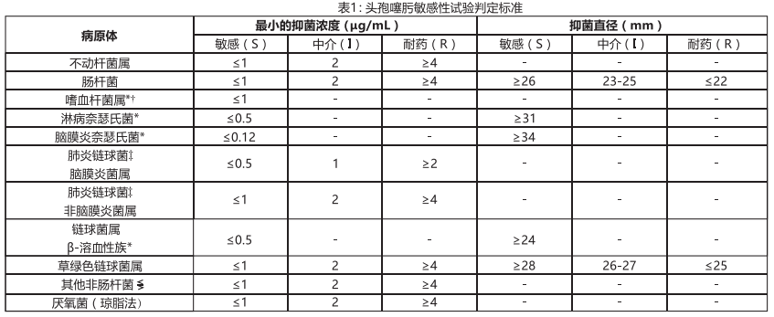采用定量方法測定最小抑菌濃度(MICs),這些最小抑菌濃度值可用于評估細菌對抗菌藥物的敏感程度。應采用標準測試方法(肉湯法或瓊脂法)來測定MICs,可根據表1中的標準對測定的MICs值進行解釋.