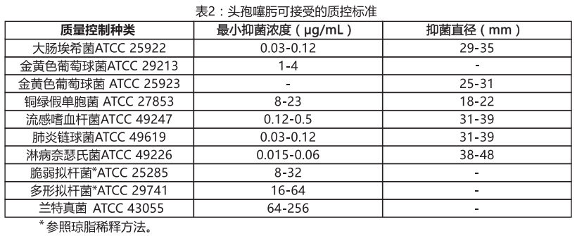 標準化藥敏試驗過程要求利用實驗室監控并確保測定過程中供試品和分析試劑的準確度和精密度,以及個人操作實驗的技術水平.應提供具有表2中MIC值的頭孢噻肟粉末標準品.對于使用擴散法的30pg的頭孢噻肟紙片的抑菌直徑標準應該符合表2的數值.